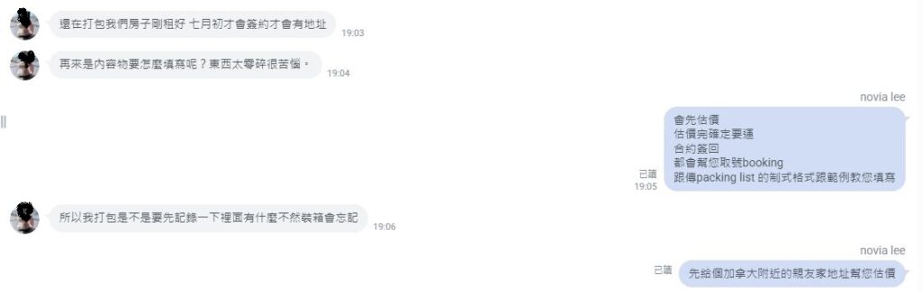 隨著文件準備完成,整個跨國搬家的流程也逐步展開。在整個過程中,楊小姐除了對加拿大入境後的海關面試流程感到些許擔心之外,也做出了一個特別的決定——她選擇在加拿大自行前往倉庫提領行李,而不是安排到府派送。這樣的方式雖然能夠節省部分費用,但也需要更完整的流程規劃與詳細說明。