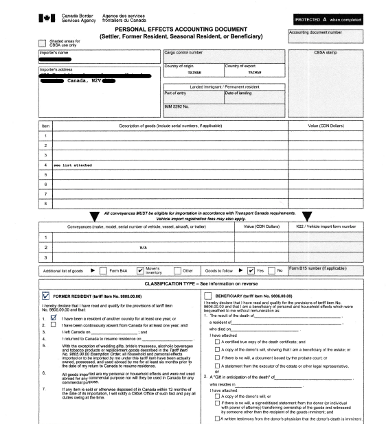 為協助客戶順利完成入境與清關面試,貨物抵達加拿大港口前,我們會再次提醒清關所需文件,包括B4文件、物品清單等,做好前往清關面試的準備。特別針對加拿大入境的 B4 表單免稅申報制度,我們也提供圖文教學與常見問題說明,讓他可以清楚準備。