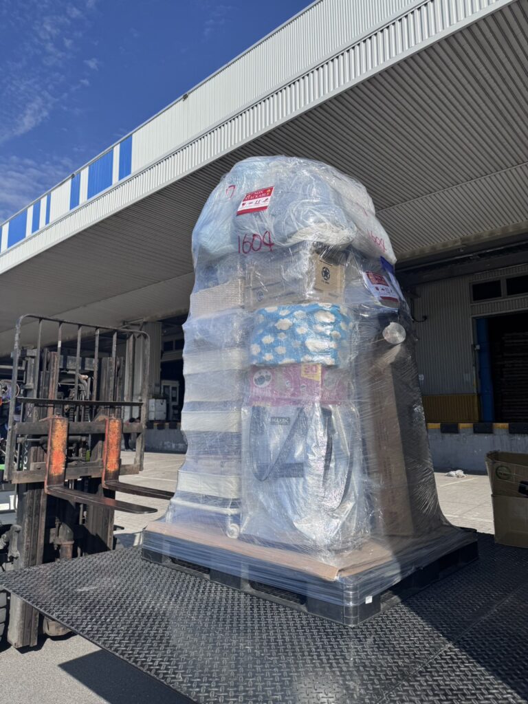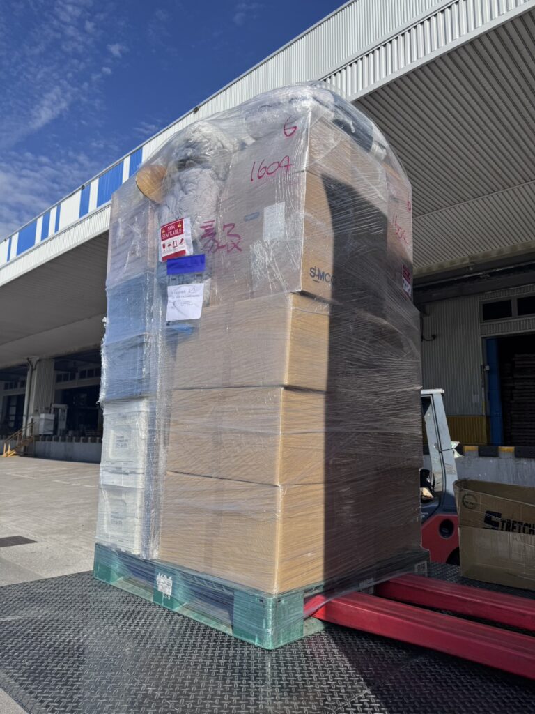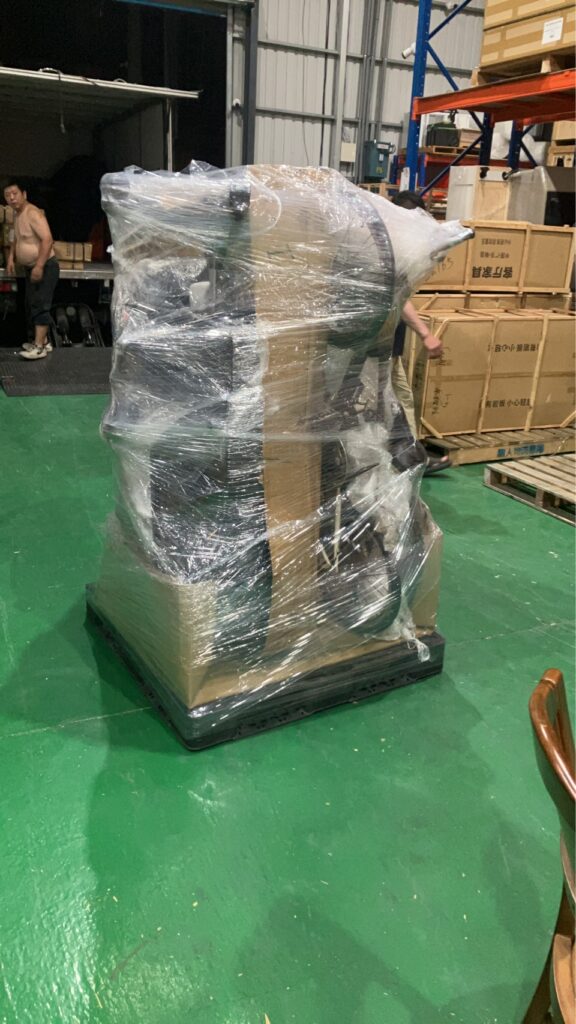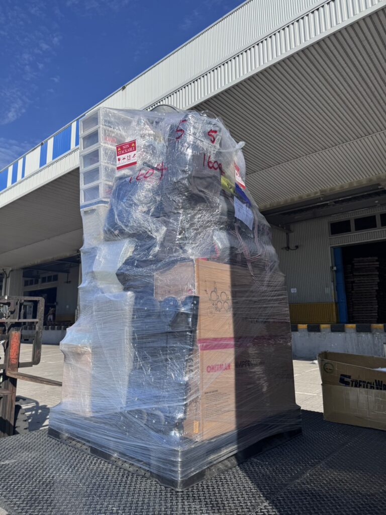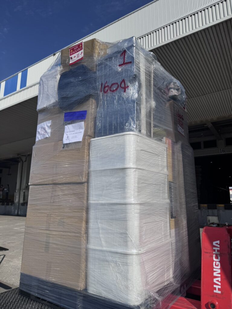 打包完畢後,物品運送至我們合作的出口倉儲,進行短期存放與棧板固定。完成出口報關流程後,正式啟運至美西。