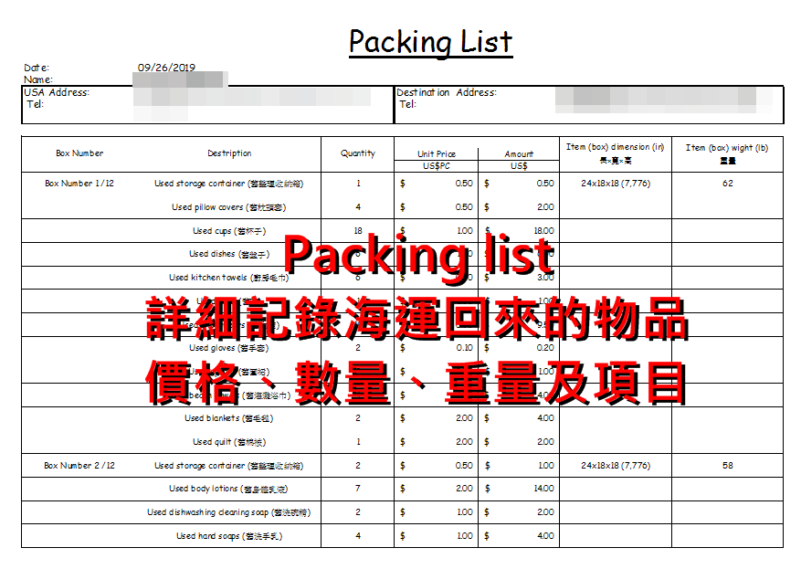 但最終仍須依海關判定為準,並需提供入境機票、護照入境章,以及完成申報程序。海運時,除了基本報關資料,Packing List(裝箱清單)也非常重要,建議內容越詳細越好,以利海關快速查驗。